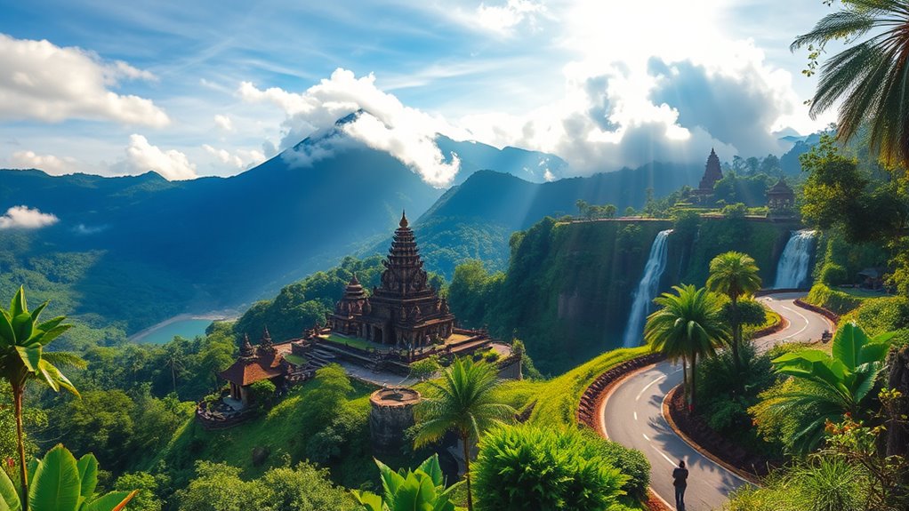Begin a vibrant road trip through Bali and East Java, where you’ll encounter stunning volcanoes, ancient temples, and breathtaking waterfalls. As you drive through lush landscapes, immerse yourself in local festivals and sample authentic flavors at markets and eateries. Explore natural wonders intertwined with cultural sites, enriching your journey with traditions and history. Continue discovering how this unforgettable adventure combines scenic beauty with lively traditions for a truly immersive experience.
