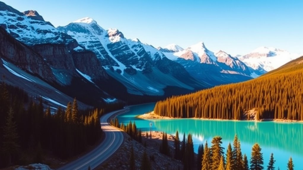 Wildlife wandering along the Icefields Parkway can include majestic moose, playful marmots, soaring eagles, and curious deer. During your wildlife spotting, stay alert and keep a safe distance to protect both animals and yourself. Remember, respecting animal safety means avoiding sudden movements or loud noises. By being mindful and patient, you’ll enjoy incredible encounters with nature’s finest, making your journey truly unforgettable and harmonious.