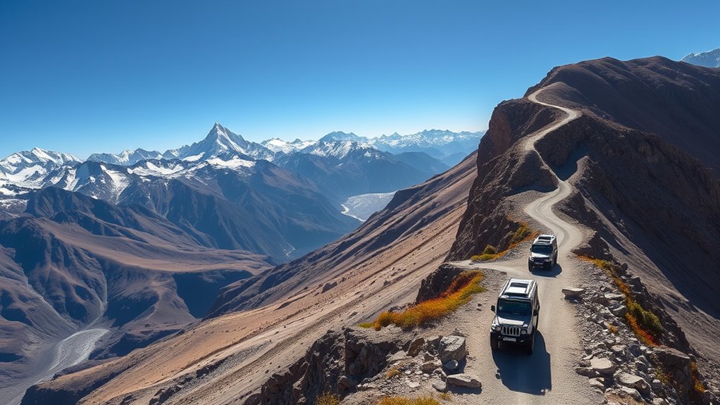 You’ll want a sturdy, high-clearance vehicle like an SUV or 4×4 to handle the route’s rough road conditions. These vehicles are suitable because they can navigate the uneven terrain, rocky patches, and high-altitude passes comfortably. Avoid low-slung cars or sedans, as they may struggle with the rugged landscape. Make sure your vehicle is well-maintained, equipped for steep inclines, and ready for unpredictable weather along this challenging but breathtaking route.