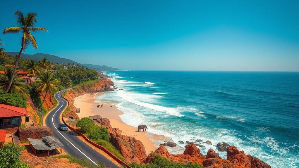 Start your journey in Galle, exploring coastal towns, markets, and local cuisine. As you travel south, enjoy scenic views of lush landscapes, fishing villages, and rolling grasslands. Make sure to stop for fresh seafood and tropical fruits along the way. Visiting Yala National Park combines wildlife safaris with chances to see elephants, leopards, and colorful birds. Keep exploring to discover more about this vibrant coastal adventure.