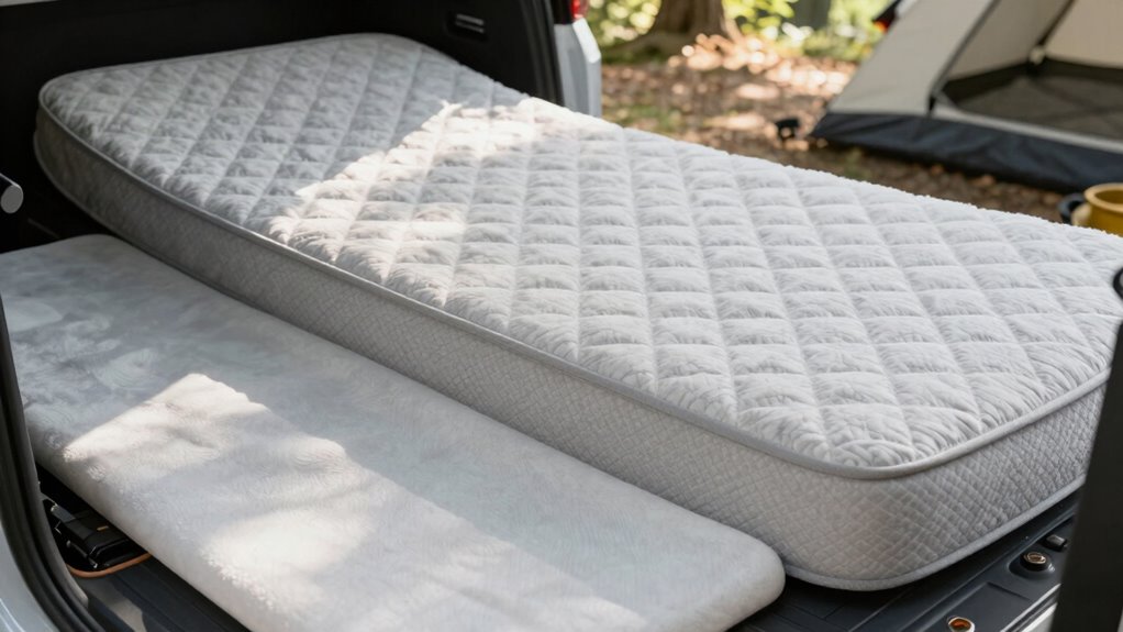 When camping on uneven terrain, a sleeping pad provides the essential support that your mattress alone may lack. It offers better terrain adaptation by filling in gaps and uneven spots, ensuring a more stable sleeping surface. If you’re traversing rocky, root-filled, or sloped ground, a quality sleeping pad helps protect your back from pressure points and discomfort. Camping gear like inflatable or foam pads molds to the terrain, providing consistent support regardless of surface irregularities. This makes them a smarter choice when you need reliable back support on unpredictable ground. While a car camping mattress might be comfortable on flat surfaces, a sleeping pad’s adaptability makes it the better option for uneven terrain, helping you sleep soundly and wake up refreshed.