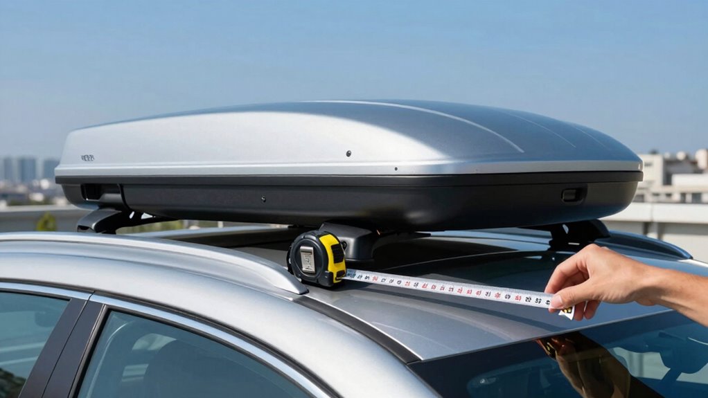Start by measuring the length of your roof rails to guarantee the cargo box fits properly. Then, determine the width of your crossbars to match the box’s mounting system. Accurate measurements save you time and prevent compatibility issues later on.