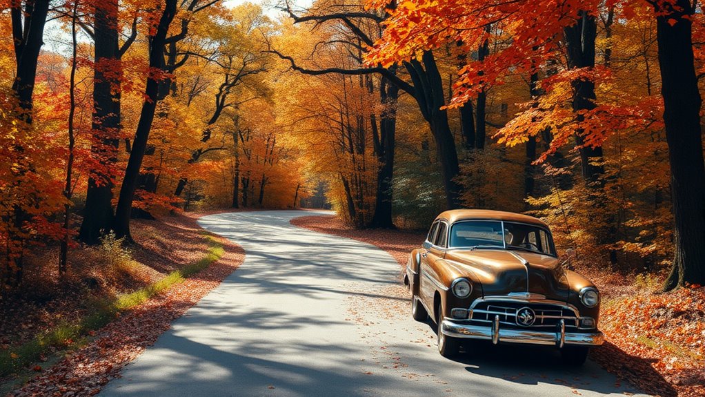 To choose the most scenic locations for your photo essay, seek out scenic overlooks that offer panoramic views and explore hidden gems off the beaten path. Trust local guides or maps to discover lesser-known spots that showcase vibrant fall foliage and unique landscapes. Be flexible, take your time, and keep an eye out for natural lighting and interesting compositions. Your eye for detail will help you capture the true essence of autumn road trips.