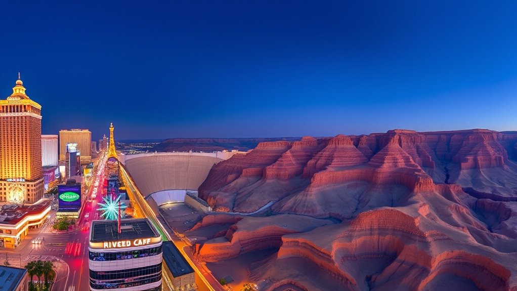 On this Nevada and Arizona road trip, you’ll start in vibrant Las Vegas, exploring the lively Strip and nearby Red Rock Canyon. Then, you’ll visit the impressive Hoover Dam, marveling at its engineering against a dramatic desert backdrop. Continuing to Grand Canyon West, you’ll take in breathtaking canyon vistas, natural formations, and wildlife like eagles and desert lizards. Get ready to experience striking landscapes and urban excitement—there’s much more to discover along the route.