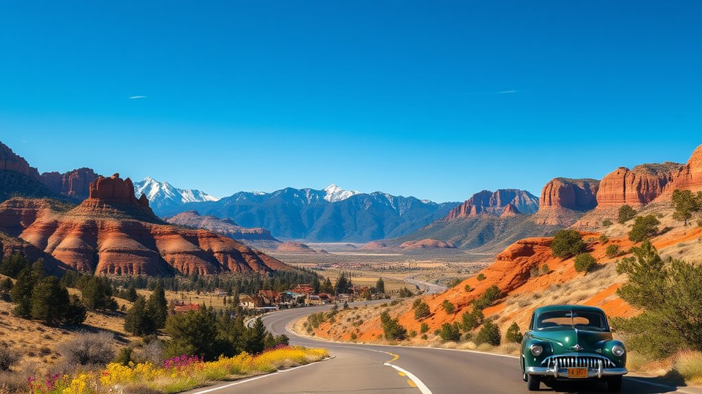 Begin a scenic drive through New Mexico’s Enchanted Circle and Santa Fe, where rugged mountains, colorful forests, and charming towns create a breathtaking backdrop. Soak in natural hot springs tucked in secluded valleys, explore vibrant art galleries in Taos and Santa Fe, and enjoy unique cultural charm with handcrafted goods. This journey effortlessly blends natural beauty, artistic inspiration, and relaxation. Keep exploring to discover more hidden gems and unforgettable experiences along the route.