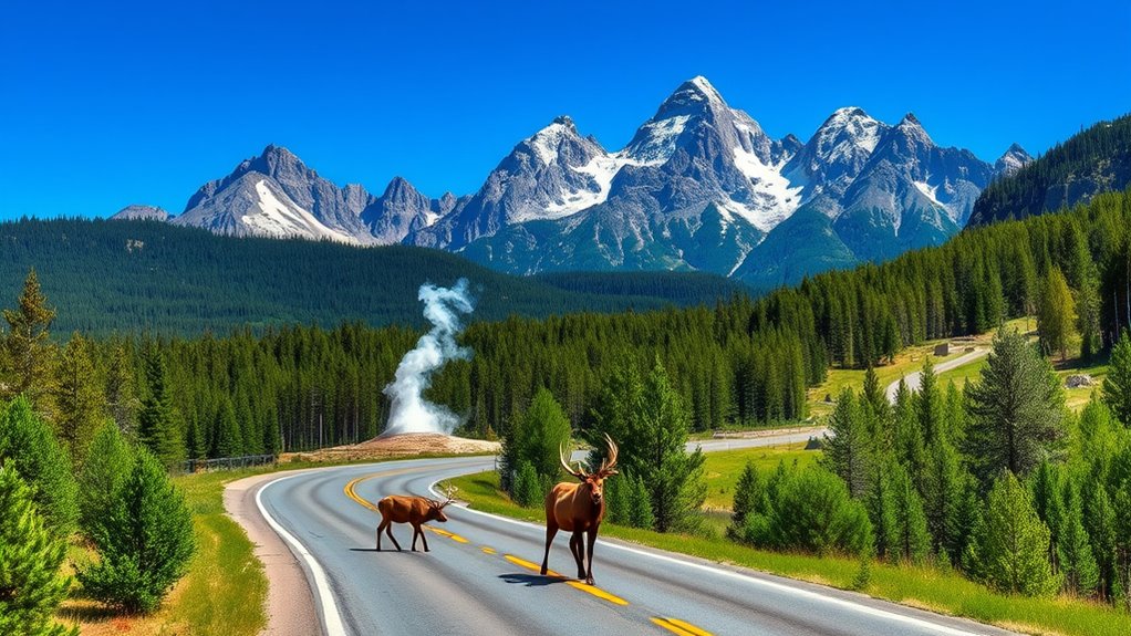 On a Yellowstone and Grand Teton road trip, you’ll experience incredible geothermal features like erupting geysers and vibrant hot springs alongside thriving wildlife such as bison, elk, bears, and wolves. Capture these stunning scenes during early mornings and late evenings for the best wildlife encounters. Stop at scenic viewpoints to photograph steaming vents and colorful springs against mountain backdrops. Keep exploring to discover tips for making the most of your adventure while respecting park regulations.
