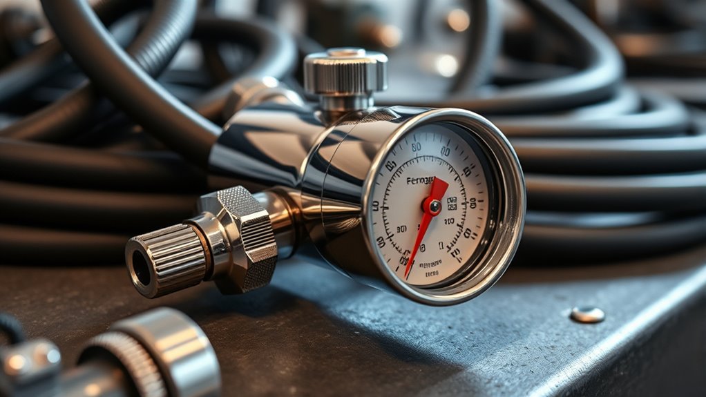 To calibrate a pressure regulator accurately, I first turn off the air supply and attach a reliable gauge. Then, I slowly adjust the regulator’s control knob while watching the gauge until it matches the desired pressure. I fine-tune it by making small adjustments, checking repeatedly, and ensuring consistent readings. Once calibrated, I turn the system back on, verifying the pressure remains steady for precise operation.