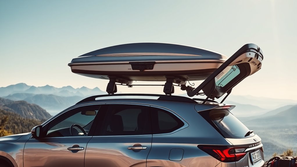 Most roof cargo boxes are compatible with a wide range of vehicles, but I always double-check first. I look at my car’s roof rack type, weight capacity, and mounting system to guarantee compatibility. Some boxes are universal, while others require specific roof rack styles. If you’re unsure, consulting your vehicle’s manual or asking a professional helps. This way, I avoid surprises and get the right fit for my car.