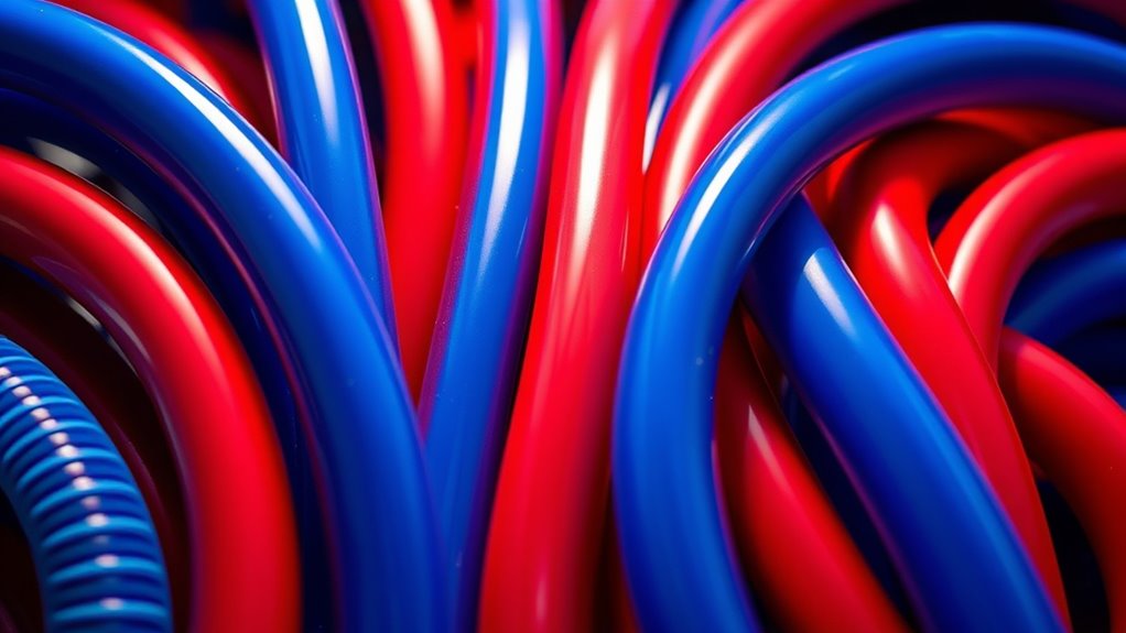 When selecting silicone coolant hoses, considering their flexibility and bend radius is vital to guarantee proper fit and reliable performance. A larger bend radius reduces the risk of kinking and promotes smooth fluid flow, which is essential for system efficiency. Reinforced hoses generally offer better flexibility, allowing tighter bends without damage. Manufacturers often specify a minimum bend radius—such as 50.5mm or five times the hose’s inner diameter—to indicate ideal flexibility limits. Bending hoses beyond this radius can introduce stress, cracks, or leaks, jeopardizing durability. Choosing hoses with appropriate bend radii makes installation easier, especially in complex engine layouts, and enhances overall system reliability. Proper attention to flexibility ensures your coolant system remains efficient and long-lasting.