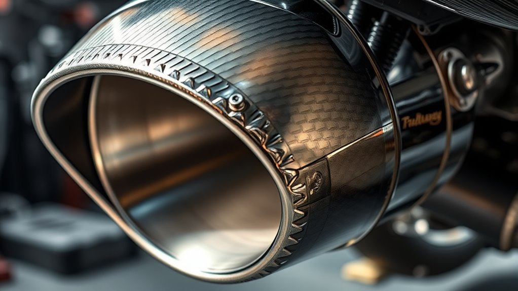 Heat shields improve exhaust performance and efficiency by protecting surrounding components from excessive heat, preventing heat loss, and maintaining ideal exhaust flow. I’ve found that a good shield reduces heat buildup, which can otherwise cause parts to overheat or degrade faster. By managing heat effectively, shields help keep the exhaust system working smoothly, boosting efficiency and prolonging its lifespan. Overall, they’re essential for maintaining peak performance and protecting your vehicle.