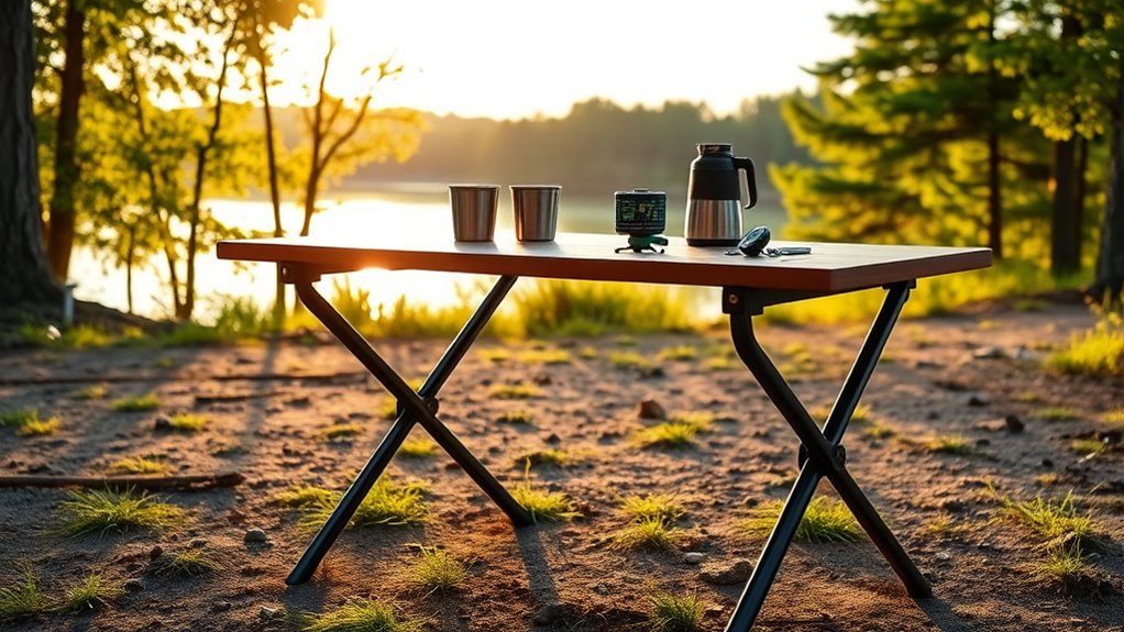 When choosing a folding camp table, stability on uneven terrain is essential for safety and convenience. I look for tables with sturdy, non-slip feet or foot caps to prevent shifting on rocky or soft ground. The frame design also matters—triangular supports or reinforced joints boost stability on uneven surfaces. Adjustable or lockable legs help keep the table level on slopes or irregular terrain. Heavier tables made from durable materials like aluminum or steel are less prone to wobbling caused by wind or weight shifts. Wide base support and balanced weight distribution further improve stability during outdoor use. Ultimately, these features guarantee the table remains steady, making your setup safer and more functional regardless of the terrain.