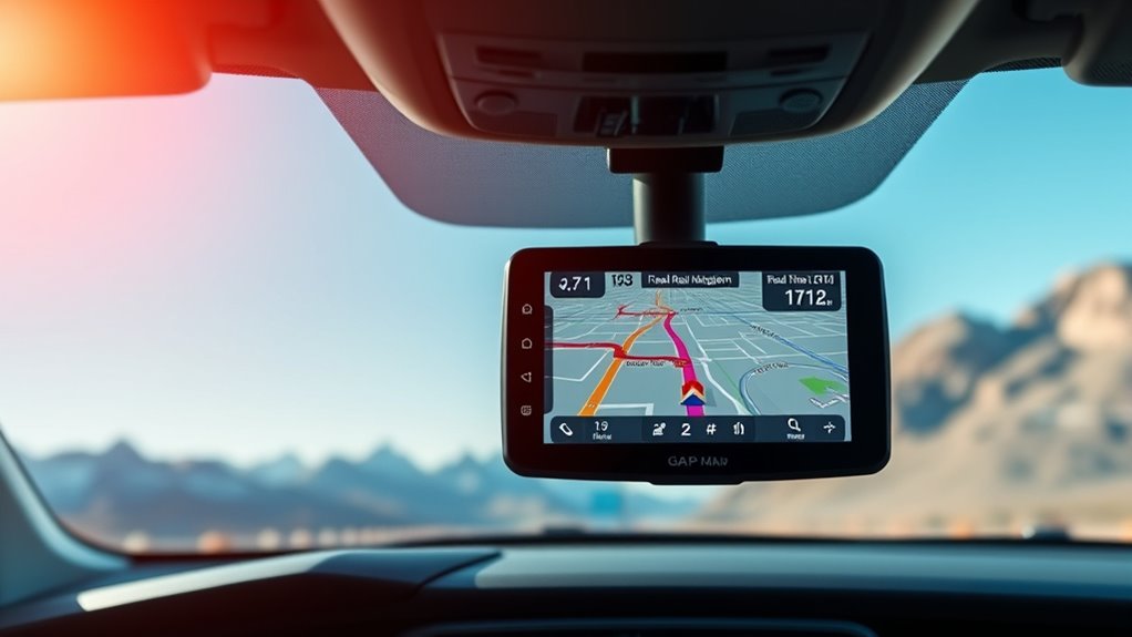 Think of safety features as your trusty co-pilot on unfamiliar roads. I look for GPS navigators with real-time traffic alerts, lane assistance, and crash detection. Voice commands help me stay focused without fiddling with screens, and detailed maps reduce surprises. These features act like a safety net, guiding me confidently through unknown terrain and helping prevent accidents, so I arrive safe and sound every time.
