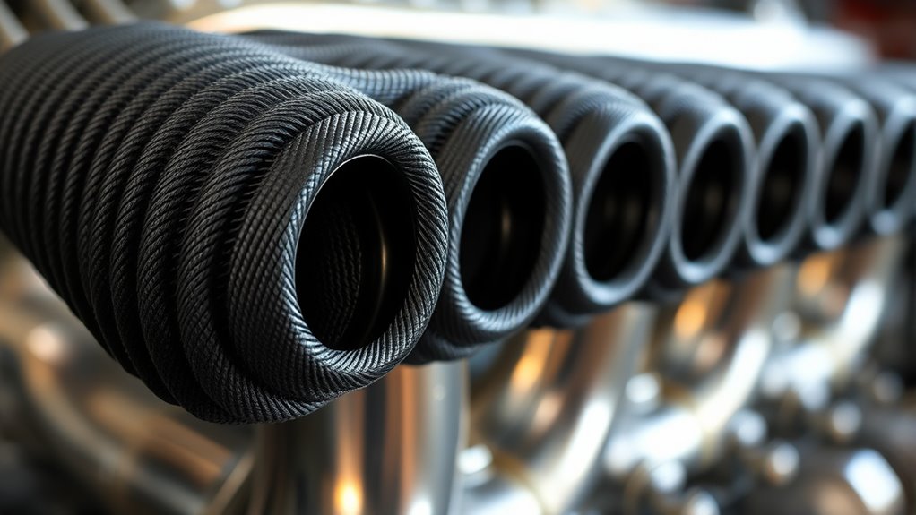 Choosing the right header wrap kit hinges on understanding its heat resistance level, which determines how well it withstands extreme temperatures without degrading. Different wraps are rated for maximum temperatures ranging from 1400°F to 2500°F, making it essential to select one suited to your exhaust system’s heat output. Fiberglass wraps typically handle up to 1500°F, while titanium and volcanic rock fiber options can endure over 1800°F. Picking a wrap with an appropriate rating prevents material failure, protects surrounding components, and reduces safety hazards. Ensuring the wrap’s temperature rating matches or exceeds your exhaust’s maximum heat guarantees effective thermal insulation and long-lasting performance. Don’t overlook this factor—it’s key to ensuring your engine remains safe and efficient under high-heat conditions.