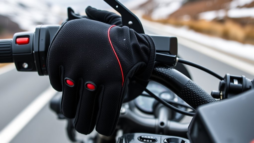 When selecting heated motorcycle gloves, waterproof and windproof features can make all the difference in harsh weather. These traits keep moisture and cold air out, ensuring my hands stay dry and warm even in rain or snow. High-quality materials like waterproof membranes, sealed seams, and water-resistant coatings are essential to create an effective barrier against the elements. Breathable waterproof fabrics are a bonus, as they let sweat escape while blocking external water and wind, preventing clamminess. Windproof features, such as reinforced shells and wind-resistant fabrics, profoundly boost heat retention by reducing heat loss caused by gusts and cold drafts. Overall, these traits not only improve comfort but also extend the gloves’ durability and usability during prolonged rides in unpredictable winter conditions.
