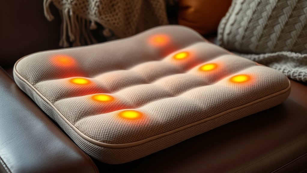 Adjustable temperature settings are essential for customizing your comfort and ensuring safe operation of heated seat cushions. With multiple heat levels, usually 3 or 4, you can easily find the perfect warmth for any situation, whether you prefer a gentle heat or a more intense sensation. Many cushions also feature intuitive controls, making it simple to switch between settings on the fly. This flexibility helps prevent overheating and guarantees safe use, especially if you’re sensitive to heat. Some models even include automatic temperature regulation or memory functions that keep your preferred warmth consistent without manual adjustments. Safety features like thermostats and overheating protection further enhance peace of mind. Overall, adjustable temperature controls give you personalized comfort while prioritizing safety during use.