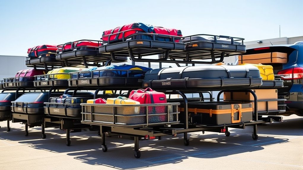 Safety and security features are essential when selecting a hitch cargo carrier because they directly impact your visibility, cargo stability, and overall road safety. Reflectors, lights, and reflective strips boost visibility during nighttime or poor weather, helping prevent accidents. Secure cargo straps, nets, and locks keep items stable and prevent them from falling off, protecting both your vehicle and others on the road. High side walls and raised rails help contain your cargo, reducing the risk of tipping or sliding out. Wobble reduction mechanisms like stabilizers and tight-fitting hitch mounts enhance stability during transit. Ultimately, proper weight distribution and adherence to the carrier’s maximum load capacity are critical to avoid damage and maintain control. Prioritizing these safety features ensures a safer, more secure hauling experience.