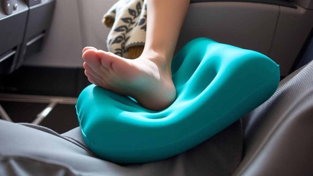 Choosing the right inflatable footrest for your flight hinges on its adjustability and comfort features, which are essential for tailoring support to your personal needs. An adjustable footrest should have multiple height options—at least three—to suit different leg lengths and seat configurations. Comfort is boosted by features like soft flocked surfaces, wide support areas, and adjustable firmness through inflation control. Being able to quickly modify the height during your flight ensures you can find the perfect elevation for better blood flow and less pressure on your lower back and legs. Footrests with double valves or multiple chambers make adjusting quick and precise, allowing you to customize your comfort level on the go. Ultimately, good adjustability and comfort help make long flights much more bearable.