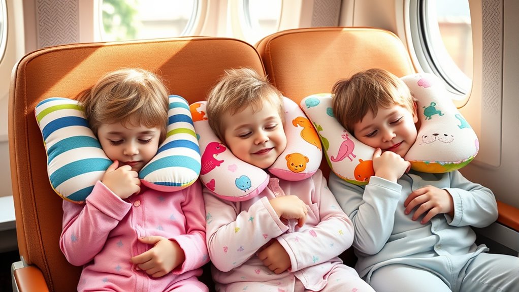 Choosing the right kids travel pillow is like finding the perfect cozy blanket for a chilly night—comfort is key. With so many adorable and supportive options out there, you’ll guarantee your little one’s head stays snug and restful on every adventure. Think of it as giving them a soft, portable cloud to lean on, turning travel time into a peaceful escape rather than a bumpy ride. Safe travels and happy snoozing!