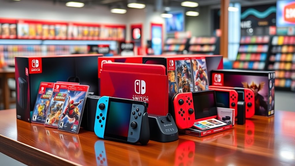 Ever wonder how choosing the right Nintendo Switch 2 bundle can enhance your gaming experience? The content variety in bundles makes a big difference. Some include popular games like Mario Kart 8 Deluxe or Mario & friends, which can add immediate fun right out of the box. Others come with exhaustive accessory kits, including protective cases, controller grips, and screen protectors, helping you keep your device safe and ready for play. Additionally, certain bundles feature extra storage options, like 128GB MicroSD cards, so you can store more digital games and downloads without worry. This variety allows me to pick a bundle that fits my gaming style—whether I prefer casual play, family gaming, or competitive matches—making the experience more personalized and enjoyable.