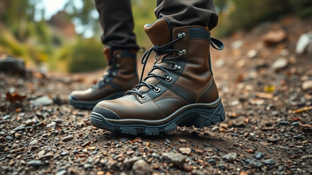 Waterproofing features are vital because off-road adventures often involve challenging wet conditions. I look for boots with Gore-Tex membranes or waterproof linings that keep water out while allowing moisture vapor to escape, so my feet stay dry and comfortable. Sealed seams and waterproof zippers also play an essential role in preventing water ingress in tough environments. I prefer boots made from treated leather or synthetic fabrics designed to resist water absorption and endure wet conditions. However, I know that waterproofing can wear down over time, so maintenance is key to preserving water resistance. Breathability is equally important, as it helps regulate temperature and moisture, reducing sweat and preventing blisters. Ultimately, effective waterproofing ensures I stay dry and comfortable during even the most demanding off-road adventures.