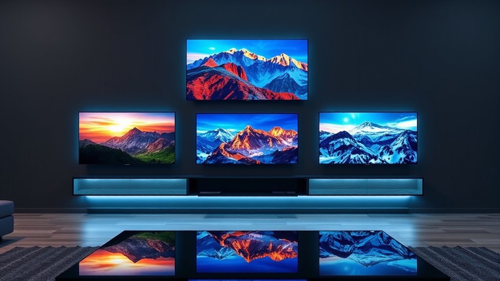 HDR support like Dolby Vision and HDR10 transforms your viewing experience by delivering a wider color spectrum and deeper contrast, making colors more vibrant and blacks truly inky. With true OLED displays, over 8.3 million self-lit pixels ensure precise, vivid colors and perfect black levels. To get the best color accuracy, look for TVs calibrated to industry standards like D65 white point and Rec. 2020 color space. Advanced processing features, such as AI Super Upscaling, help maintain color fidelity even with lower-resolution content. Brightness management tools like Brightness Booster keep colors lively and true to life across various lighting conditions. When shopping for an OLED TV this Black Friday, prioritize models that excel in HDR support and color calibration for a truly immersive viewing experience.