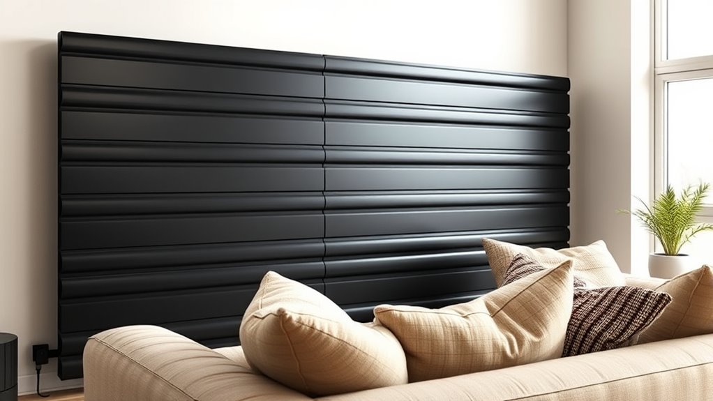 Most oversized radiators come with safety features like thermal cut-off switches, which automatically turn off the radiator if it overheats, and sturdy, secure mounting brackets to prevent accidents. Many also have rounded edges and protective grills to reduce injury risks. I always look for models with these safety elements to make certain of peace of mind while keeping my space warm and stylish. Safety first, always!