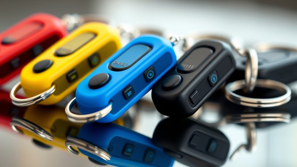 Choosing the right attachment option for a personal safety alarm keychain is vital because it directly affects how easily I can access and secure the device. I look for options like keyrings, carabiners, wrist straps, or clip-on hooks that match my daily habits. A secure, durable attachment ensures the alarm stays put and doesn’t fall off during emergencies. Multi-way attachments are especially convenient, letting me attach the alarm to keys, bags, belts, or clothing. I also prioritize hardware that’s corrosion-resistant and sturdy enough to handle daily wear and outdoor conditions. Additionally, I consider whether the attachment allows quick and easy removal or activation, which is essential in high-stress situations where every second counts. The right attachment keeps my safety device accessible and reliable at all times.