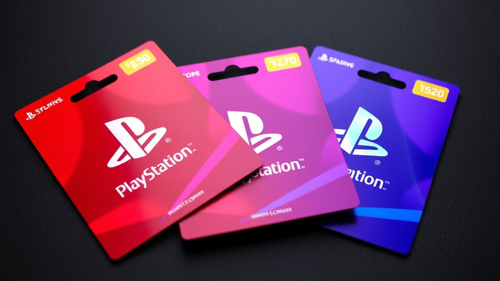 When selecting a digital delivery method for your PlayStation Store gift card, it’s important to contemplate how you’ll use and redeem the code. Instant delivery options, like email codes or download links, let you give and redeem the gift immediately, which is perfect for last-minute surprises. Email delivery is secure and allows you to add personalized messages, making it more personal for the recipient. Some platforms offer app-based or mobile wallet options, giving quick access on compatible devices. Consider how easy it is for the recipient to access and redeem the code, as well as the security features involved. Choosing the right method ensures a smooth, hassle-free gifting experience, whether you want instant access or a more personalized touch.