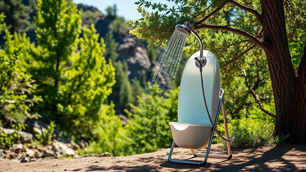 Choosing a portable camp shower requires paying close attention to durability and material quality, since outdoor conditions can be tough on gear. I look for showers made from high-grade plastic, stainless steel, or reinforced fabric, which can handle rough handling and frequent use. Water-resistant or waterproof construction, rated at IPX8 or higher, is essential to protect internal components from water damage during outdoor activities. Robust sealing and reinforced joints help prevent leaks and cracks, extending the shower’s lifespan in rugged environments. Using impact-resistant and corrosion-proof materials ensures the shower withstands accidental drops, exposure to salt, or dirt. Quality craftsmanship—sturdy hinges, secure fittings, and reinforced seams—also plays a crucial role in making sure the shower remains reliable and durable wherever I take it.