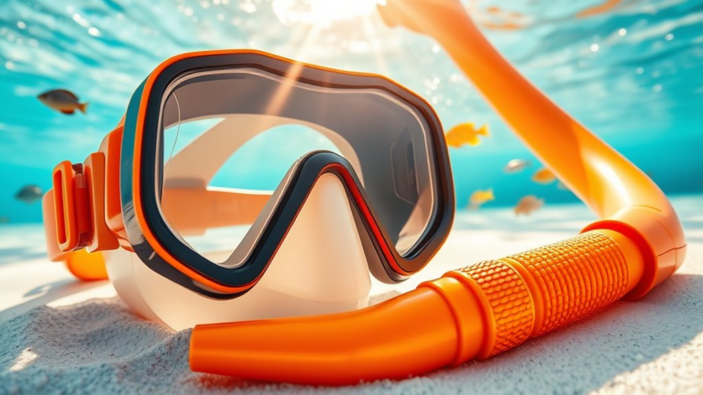 Clear visibility is essential for an enjoyable snorkeling experience, and selecting a kit with quality lenses makes all the difference. Impact-resistant tempered glass lenses with anti-fog coatings prevent fogging and guarantee a clear view underwater. A wide field of view, such as 180° panoramic lenses, enhances awareness and reduces blind spots, giving a better sense of your surroundings. Anti-fog technology, like coatings or drops, keeps your vision crystal clear during extended sessions. Impact-resistant lenses also ensure durability and safety, resisting shattering or cracking under pressure. Proper lens design, including side windows or multi-pane configurations, can considerably boost peripheral vision and underwater clarity. Prioritizing these features helps you enjoy a sharper, more immersive snorkeling adventure.