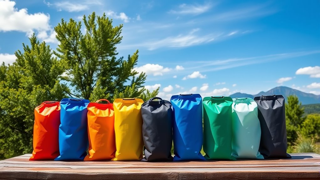 Durability and material quality play a vital role in guaranteeing my solar camp shower bag lasts through many outdoor adventures. I look for bags made from reinforced PVC or high-quality, tear-resistant fabrics that can handle rough terrain and exposure to sunlight. The thickness of the PVC, especially if triple-layered or reinforced, makes a big difference in resisting punctures, tears, and deformation. Sealed seams and explosion-proof caps are essential to prevent leaks and withstand repeated use. Since environmental exposure can degrade plastic over time, I prefer UV-resistant materials to maintain the bag’s integrity. Proper maintenance, like cleaning and drying after each use, also helps extend its lifespan. Choosing a durable, well-made shower bag ensures I stay fresh outdoors without worrying about unexpected leaks or damage.