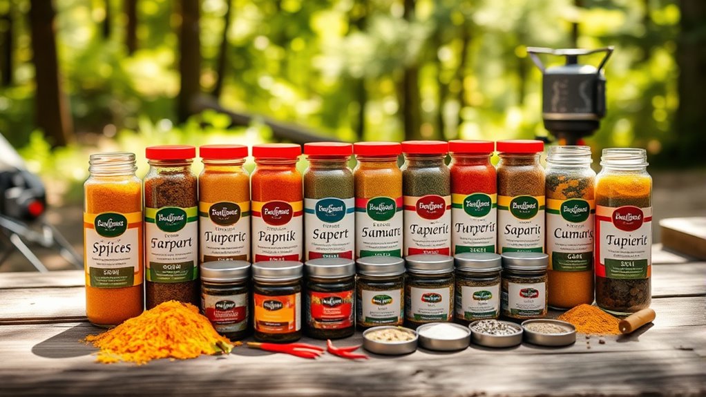 If you’re looking for the best spice kits for camping that make every meal delicious, I’ve found some great options. From compact sets with 9 or more jars, waterproof containers, and sturdy cases to versatile kits with labels and accessories, there’s something for every outdoor cook. These kits guarantee your spices stay fresh and organized during your adventures. Keep exploring to discover the top picks that fit your needs perfectly and elevate your outdoor cooking game.