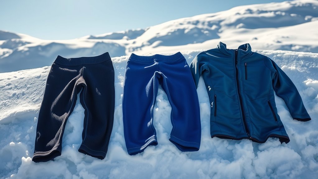 Choosing the right thermal underwear for skiing depends heavily on balancing breathability and insulation. Breathable fabrics like polyester and spandex let moisture vapor escape, helping you stay dry and comfortable. Insulating materials, such as fleece lining, trap heat to keep you warm, but must also allow airflow to prevent overheating. Moisture-wicking properties are key—they draw sweat away from your skin, enhancing both warmth and comfort. It’s essential to find a fabric combination that provides enough insulation without trapping moisture, which can lead to dampness and discomfort. Overly insulated or non-breathable materials can trap heat and moisture, increasing the risk of chills or hypothermia. Ultimately, selecting fabrics that offer both breathability and warmth ensures you stay dry, comfortable, and well-protected on the slopes.