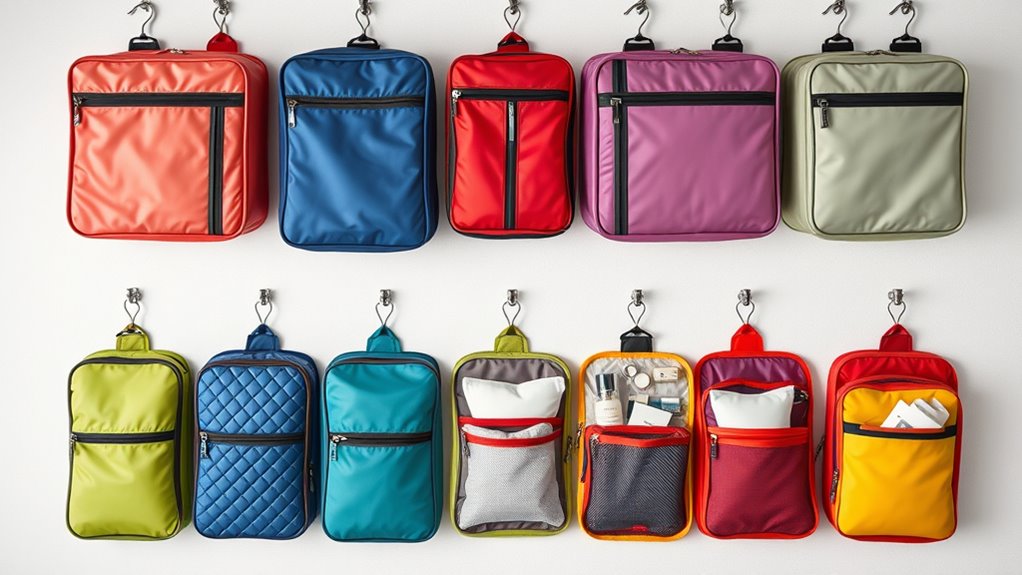 When selecting a hanging toiletry bag, considering its versatility guarantees it can meet different travel situations. A good bag should hold full-sized bottles, cosmetics, and accessories, adapting to short trips or longer stays. Multi-compartment designs with transparent or mesh sections make organization and access easier, saving time at security checks or in hotel rooms. Features like a sturdy, retractable hook and a handle allow you to hang the bag in various environments—bathrooms, hotel rooms, or outdoor spaces—adding convenience. Water-resistant and leakproof materials protect your belongings from spills and moisture, regardless of where you’re traveling. A flexible interior layout that can expand or reconfigure ensures the bag remains practical, whether you’re packing light or carrying more for extended trips.