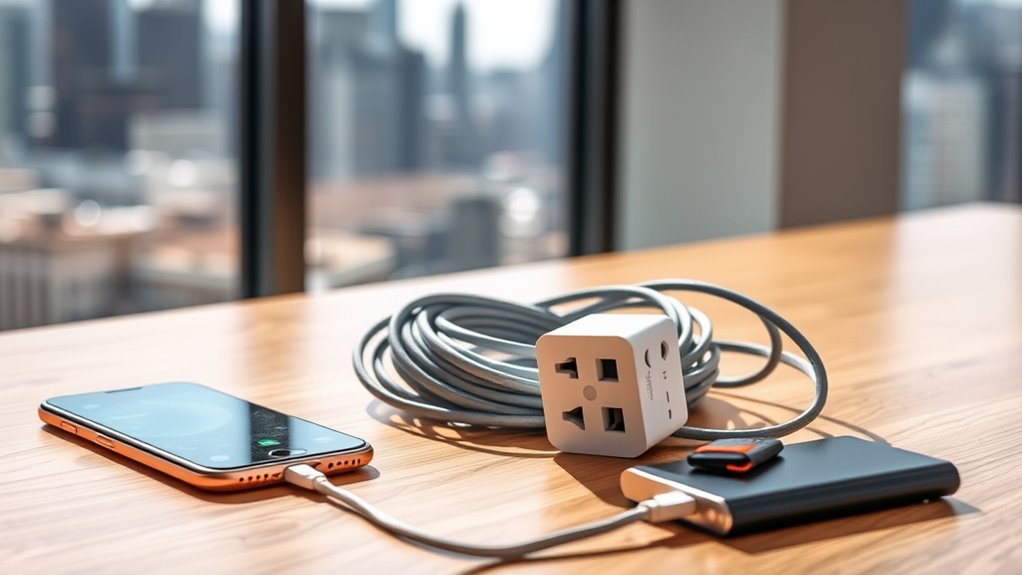 Choosing the right travel extension cord starts with guaranteeing it matches your devices’ plug types and the outlets at your destination. I check that the cord supports the voltage and current ratings needed for my electronics to avoid overloads or damage. If I plan to charge smartphones or tablets, I look for a model with USB ports, eliminating the need for separate chargers. Safety compliance is vital, so I verify that the cord meets regional standards and cruise line policies. Additionally, I consider design features like flat plugs or universal outlets, especially for tight or diverse outlet setups. Matching the cord’s compatibility ensures safe, efficient charging without hassle, giving me peace of mind wherever I travel.