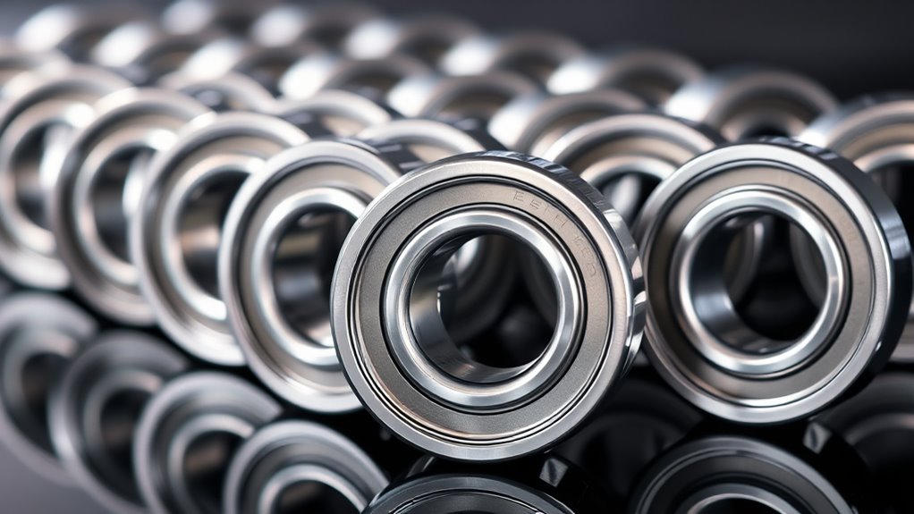 The durability of wheel bearings largely depends on the materials they’re made from, with high-quality chrome steel standing out as a top choice. Chrome steel offers exceptional resistance to wear and long-term reliability, making it ideal for trailer use. Its resistance to corrosion and rust is especially important for outdoor environments, preventing premature failure. High-quality bearings with strict manufacturing tolerances reduce vibration and noise, enhancing overall durability. Double lip grease seals made of durable rubber act as a defense against contaminants and leakage, further extending the bearing’s lifespan. Regular maintenance and proper lubrication are essential to preserve these bearings’ integrity and maximize their service life. Choosing bearings made from durable materials guarantees your trailer performs reliably over time.