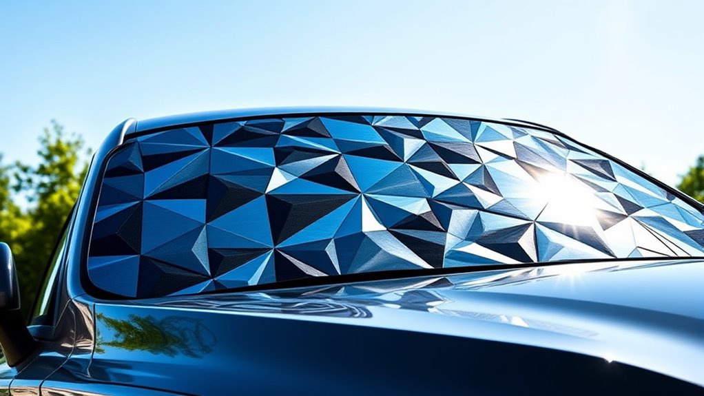 The material of your windshield sun shade plays a crucial role in its ability to reflect UV rays and heat, directly impacting how effectively it keeps your car cool. Reflective surfaces like aluminum or silver-coated fabrics excel at bouncing heat away, providing superior heat rejection. Durability depends on the quality of the fabric; high-density polyester, such as 240T or 300T, resists tearing, fading, and cracking over time. Multi-layered designs with reinforced stitching and sturdy frames boost longevity and performance, preventing deformation after repeated use. Additionally, materials with special coatings like titanium or high-temperature layers enhance durability under extreme sunlight. Choosing weather-resistant fabrics ensures your sunshade maintains its protective qualities despite exposure to wind, rain, and frequent folding, making it a smart long-term investment.